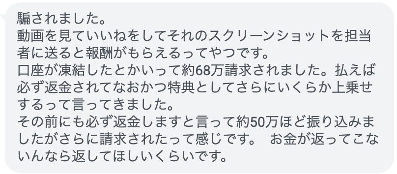 内容をまとめると、返金を約束したにも関わらず、50万円程振り込みしたらさらに68万円の請求があったということ。