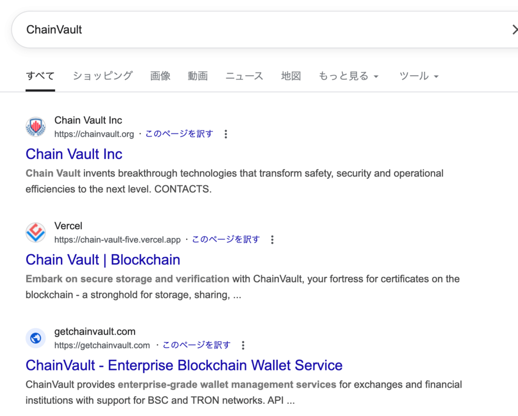 こちらは、Googleで「ChainVault」を検索した結果になります。