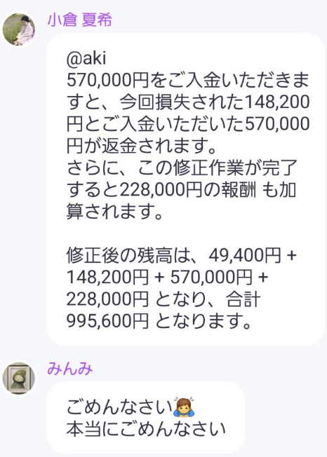 こちらでも、「みんみ」というサクラがミスをグループに謝るといったシナリオが展開されています。