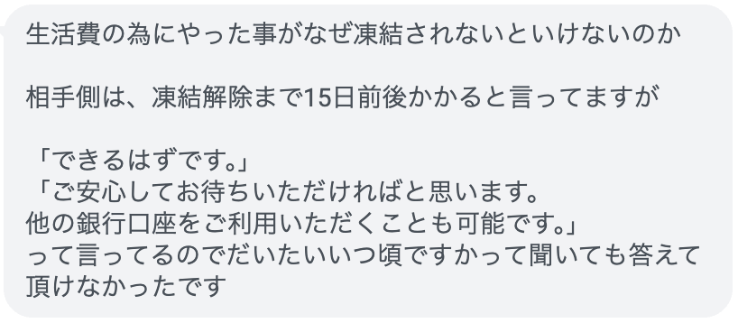 金銭のやり取りをしていた口座が凍結したという内容になります。