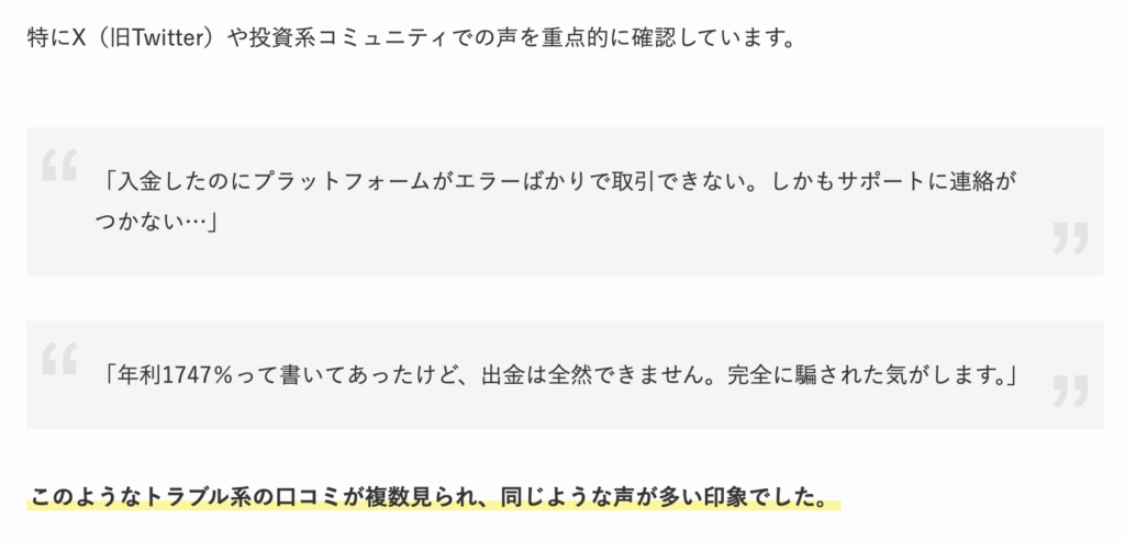 また、他のサイトではXで「取引や出金ができないといった声がある」と書かれていました。