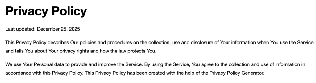 プライバシーポリシーとして、特におかしい点はありませんが、日本語に翻訳すると、更新日は2025年12月25日。