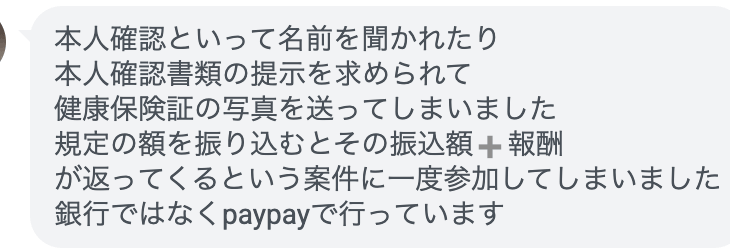 この件の厄介なところは報酬が実際に振り込まれるというところで、報酬があることで信じてしまうことが一番の要因です。